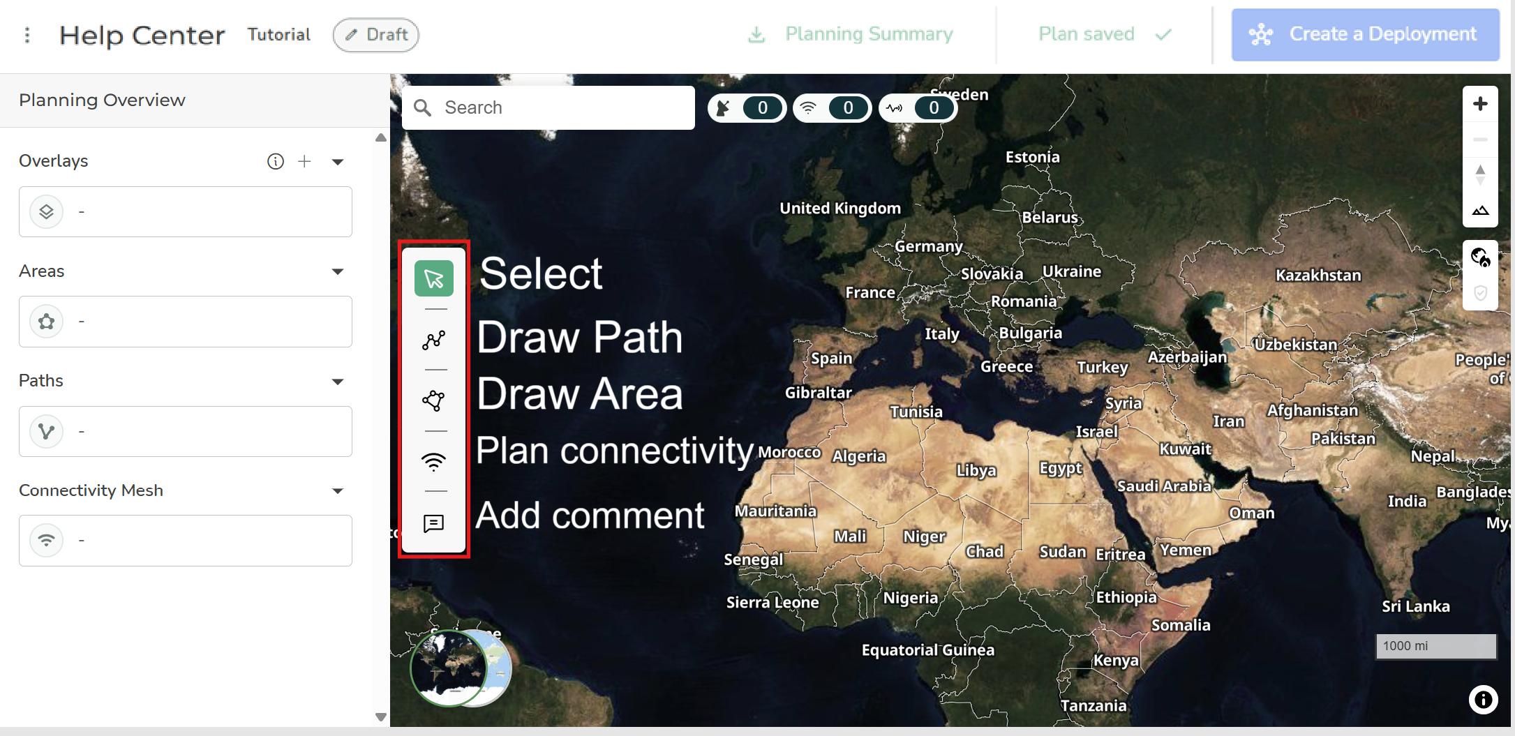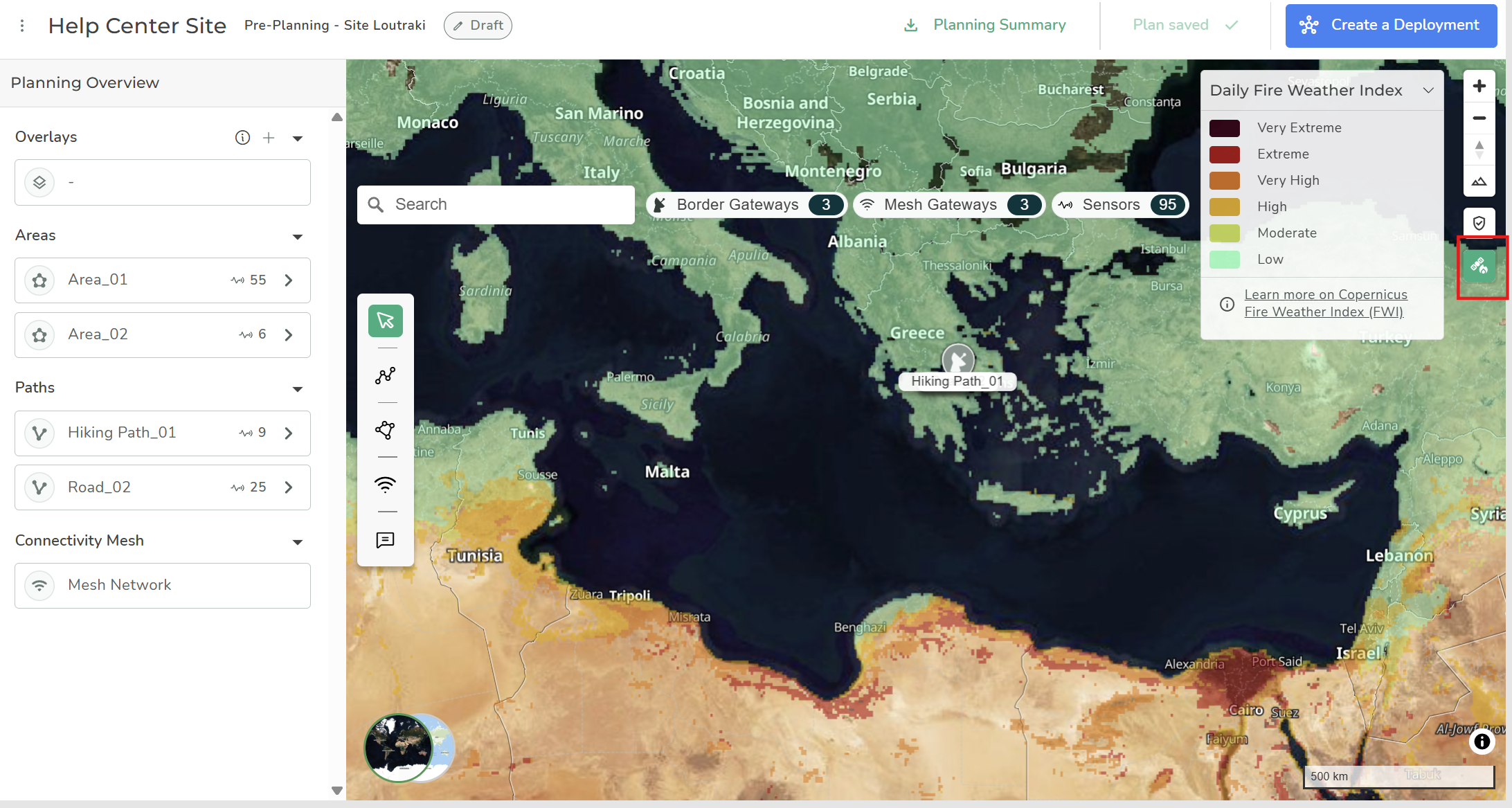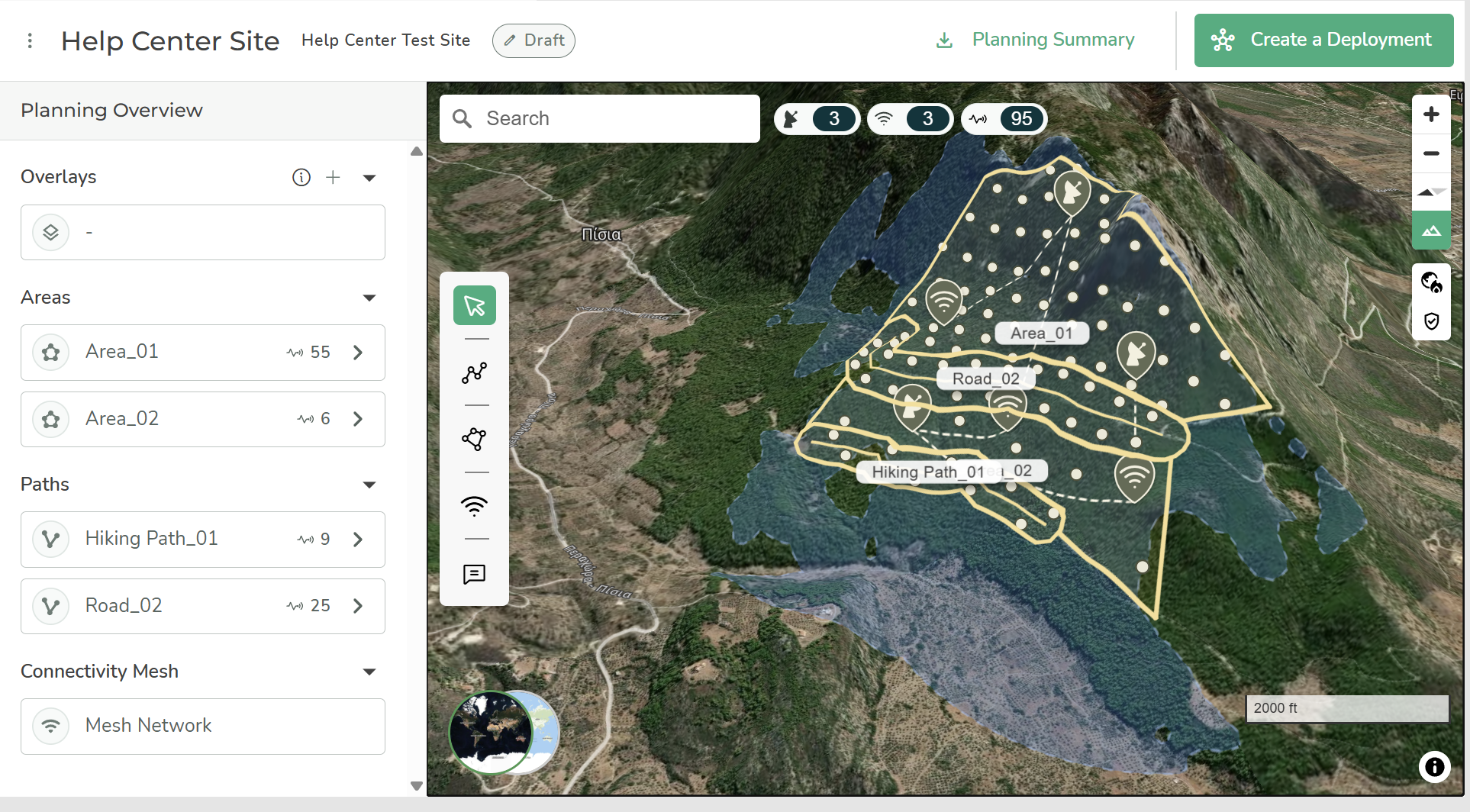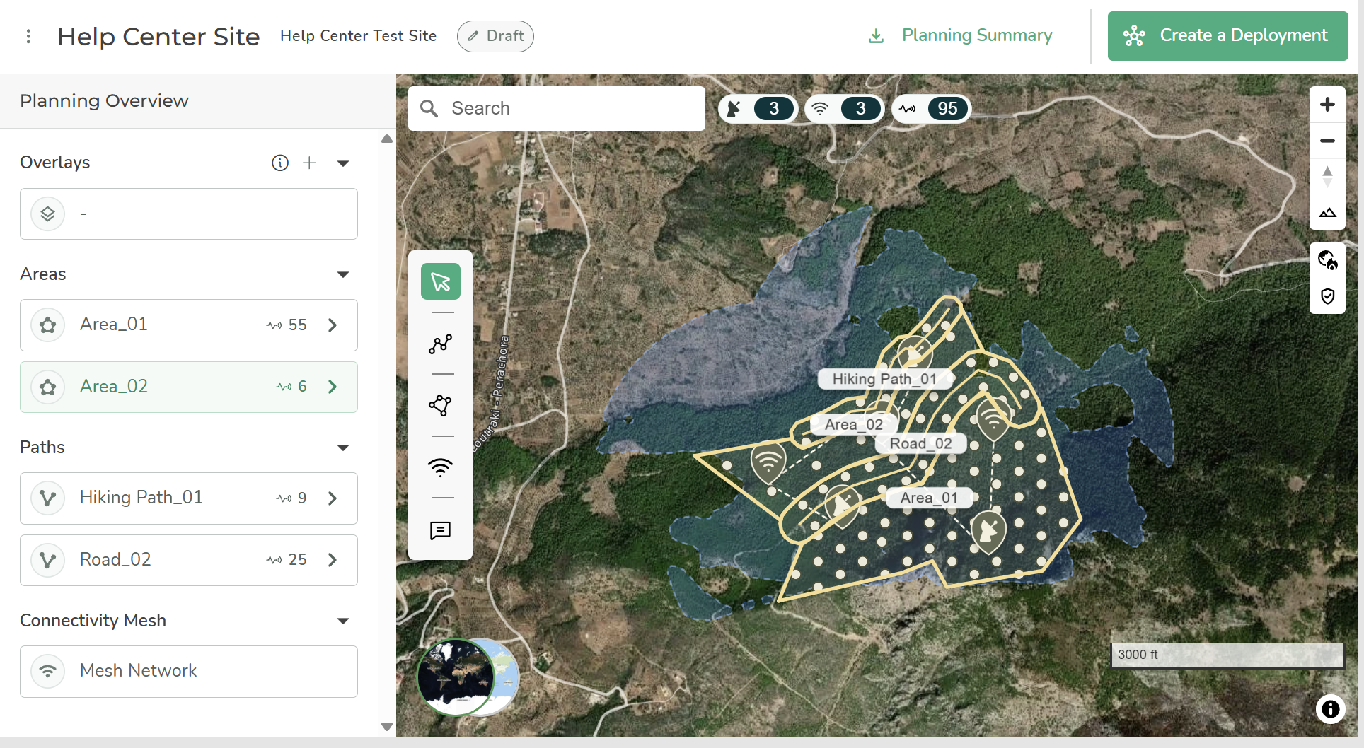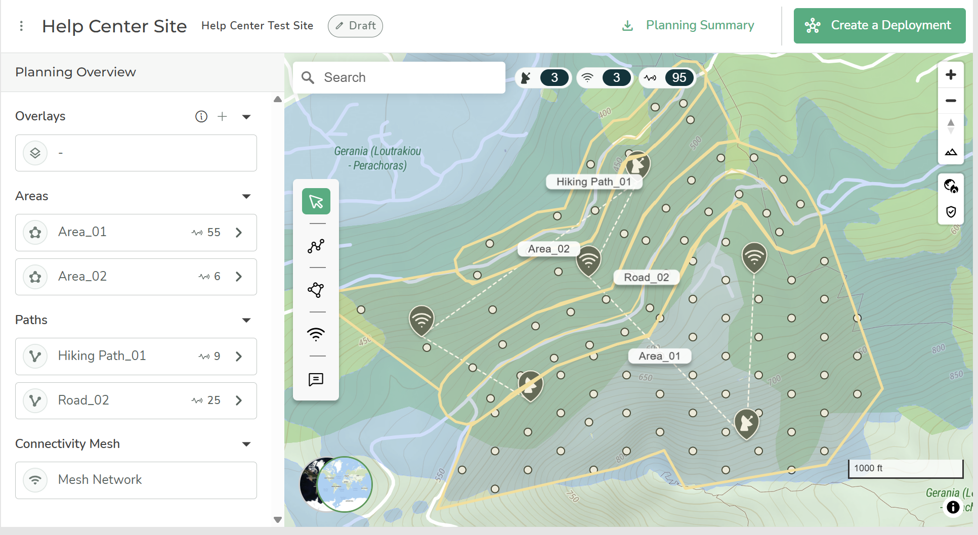 - Draw path: Use the Path tool to define high-density deployment areas such as hiking paths, rail lines, power lines.
