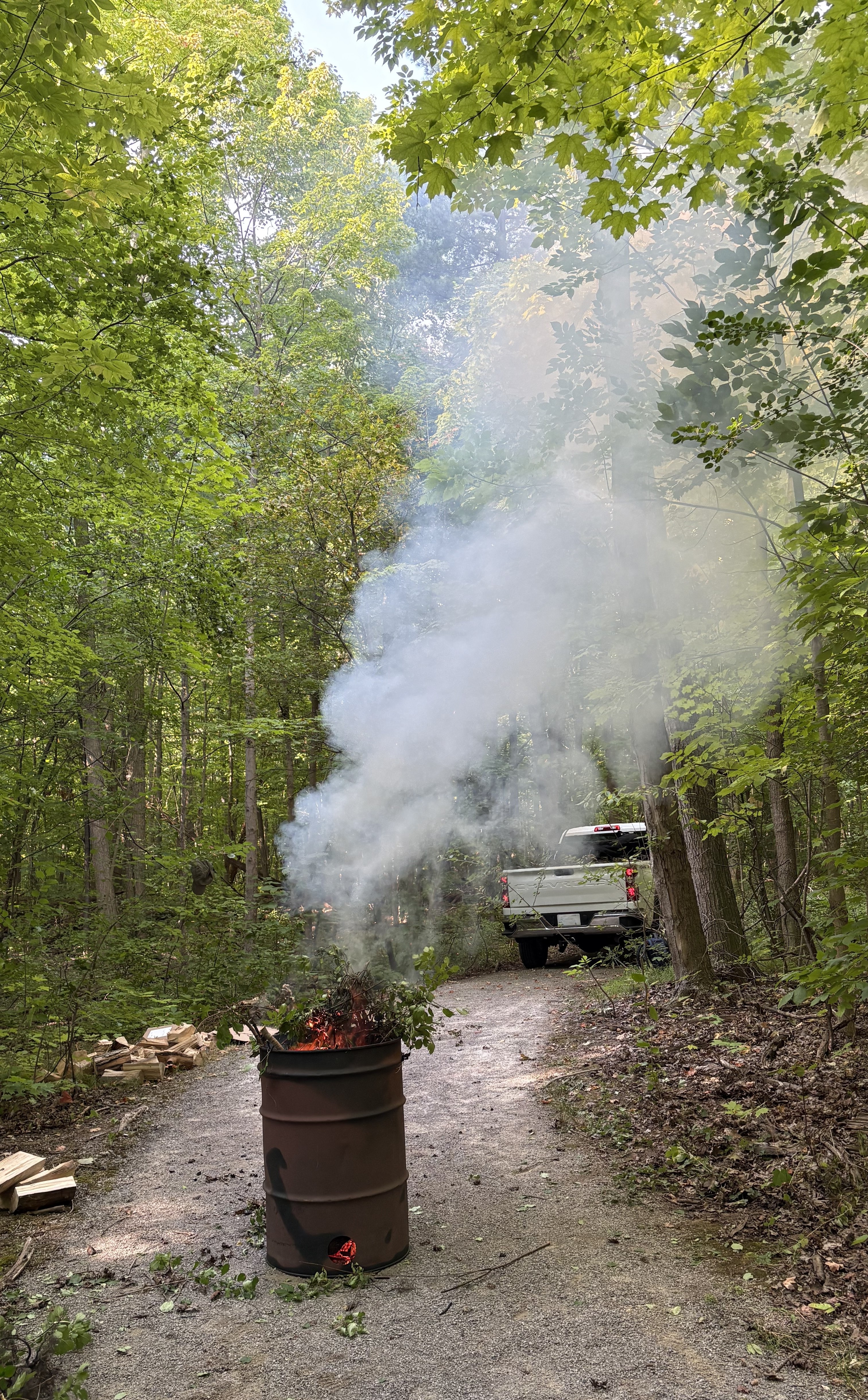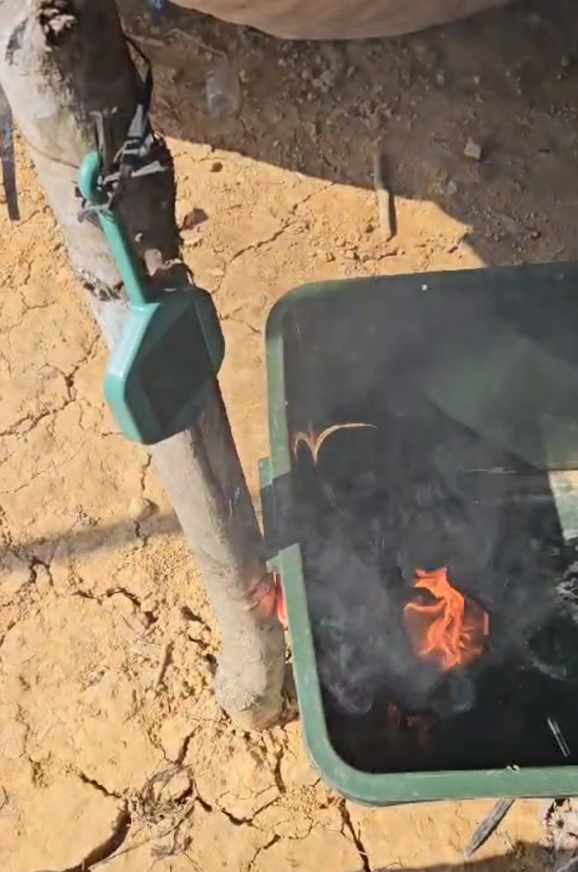 Burning material inside buckets or barrels causes gases to rise vertically in a narrow column.