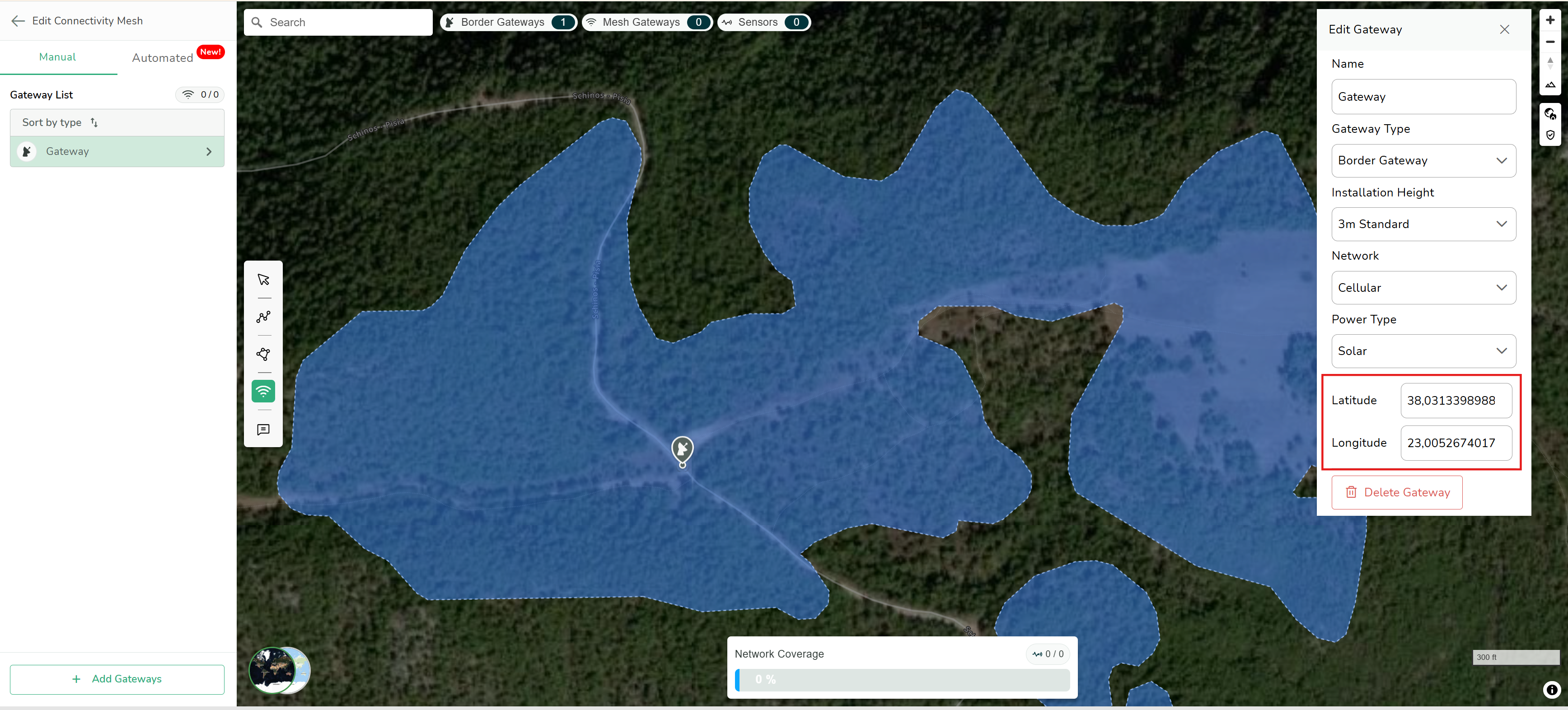 The Silvanet Planning Tool allows you to manually enter geo-location coordinates for any device using the device properties panel. This enables you to set precise, fixed Gateway positions when their installation location is predetermined.