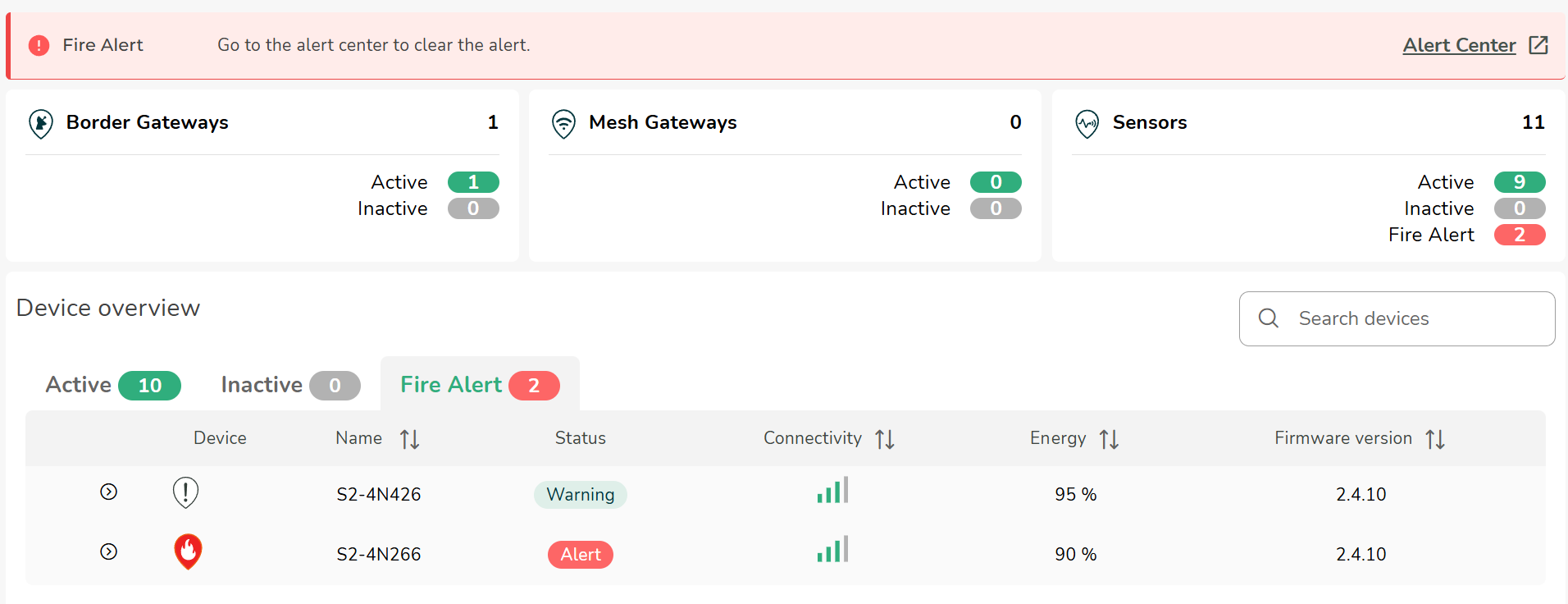 Selecting this tab displays the sensors that have triggered a fire detection event. It also shows warning-level devices & early alerts, which indicate early signs of anomaly detection before a full fire alert is raised.