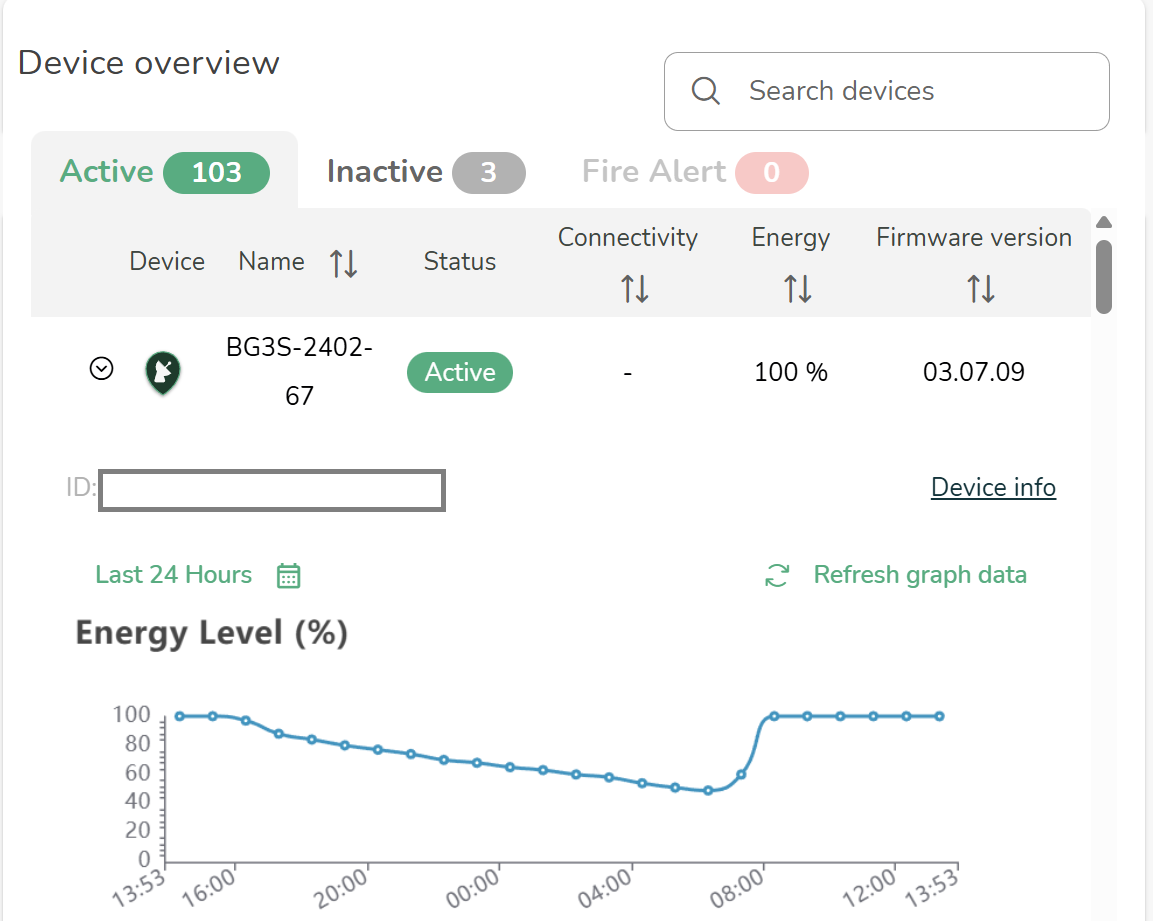 When expanded, you can view a graph of the device’s energy level over time and access quick actions like Device info and Refresh graph data.