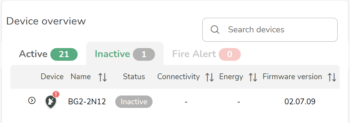 The Inactive tab lists the inactive devices in the same structure as the Active tab, but: