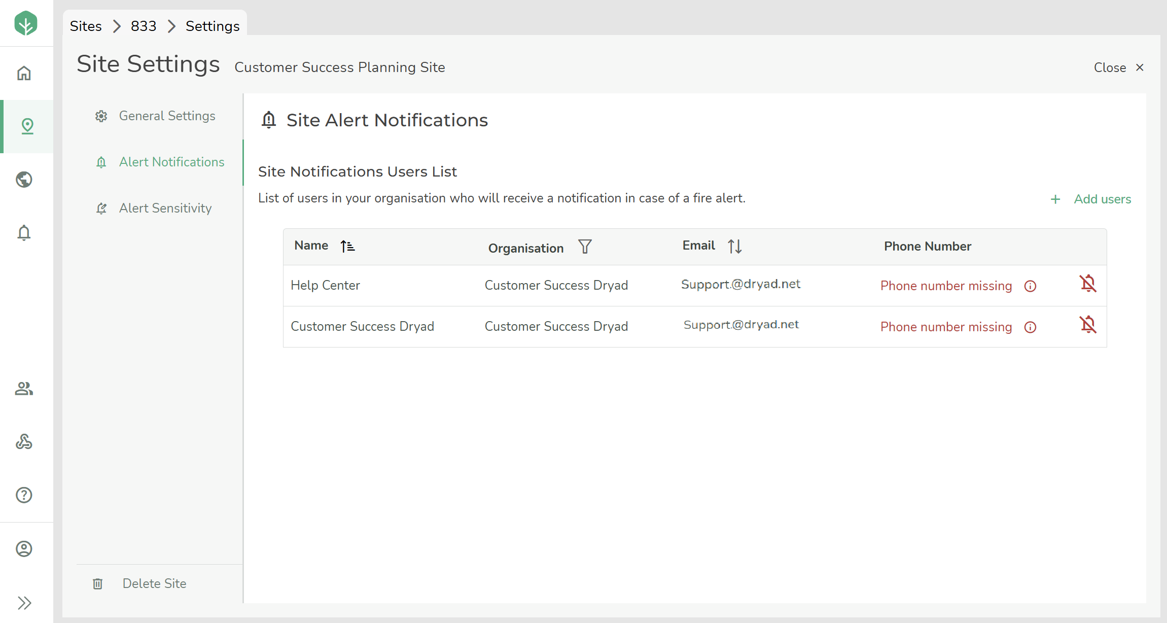 Admins can manage who receives notifications for a specific site, including both fire alerts and inactive device notifications.